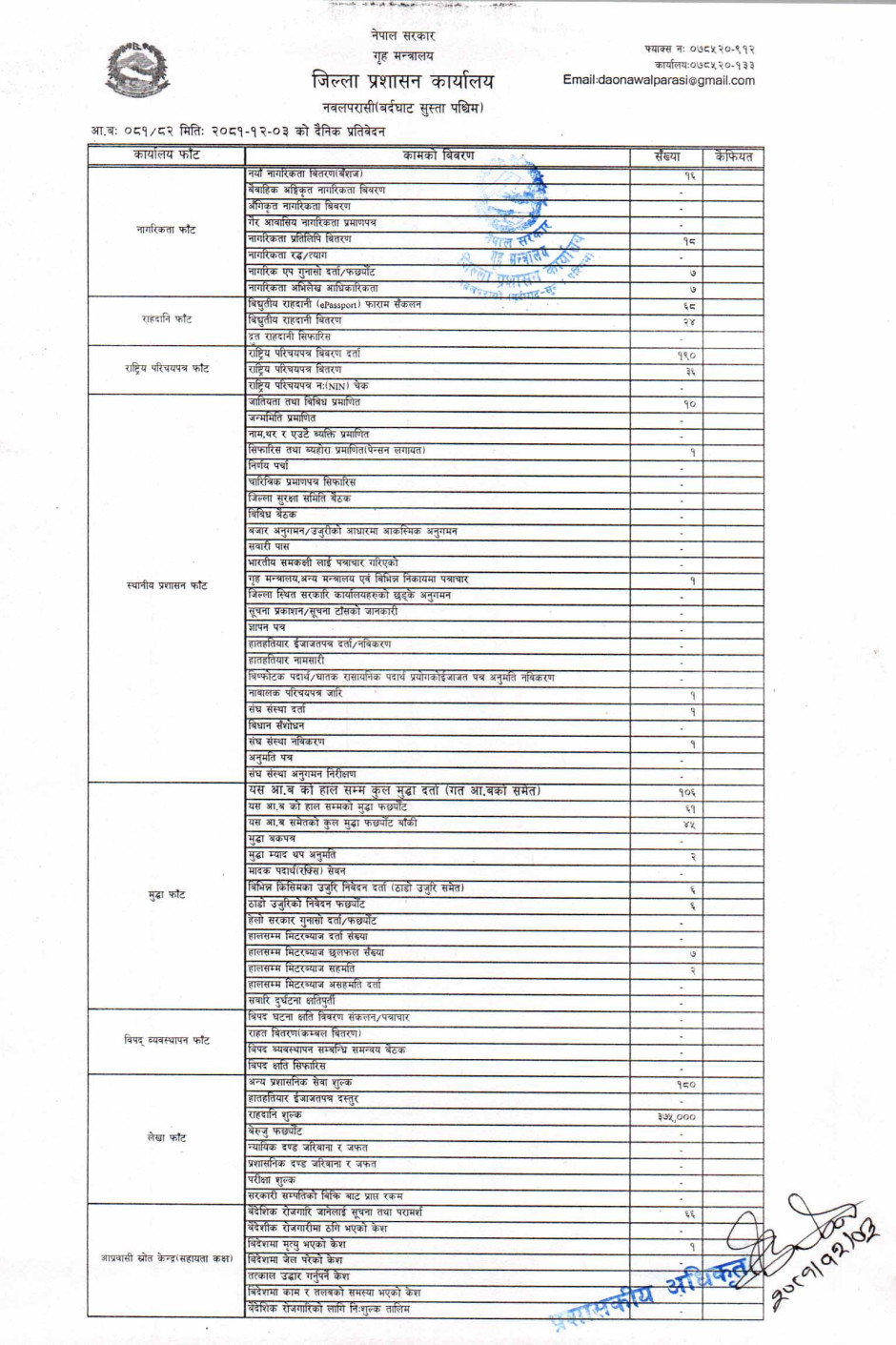 तस्बिर : मिति २०८१।१२।०३ गतेका दिन सम्पादित गरिएका कार्यको संख्यात्मक विवरण
