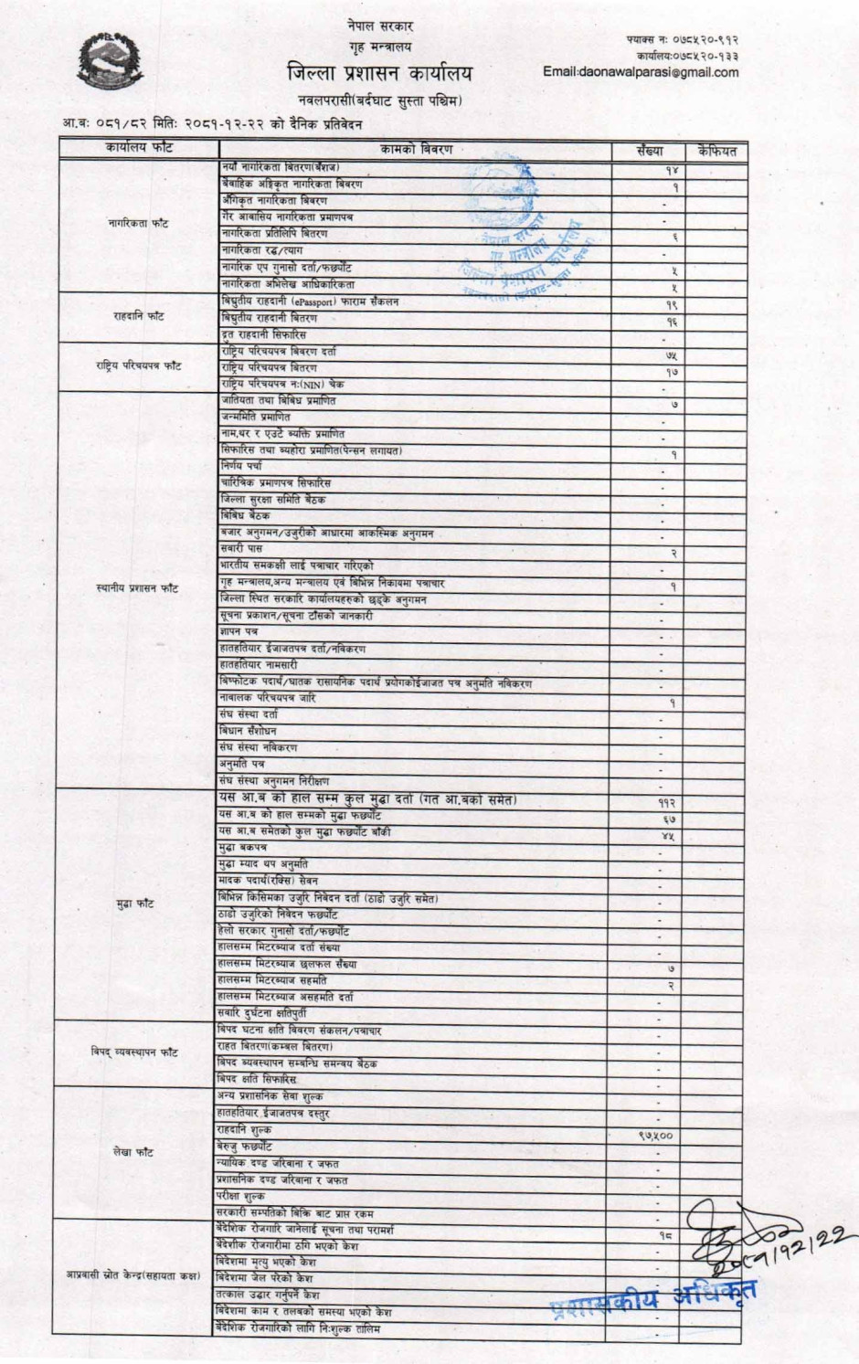 तस्बिर : मिति २०८१।१२।२२ गतेका दिन सम्पादित गरिएका कार्यको संख्यात्मक विवरण