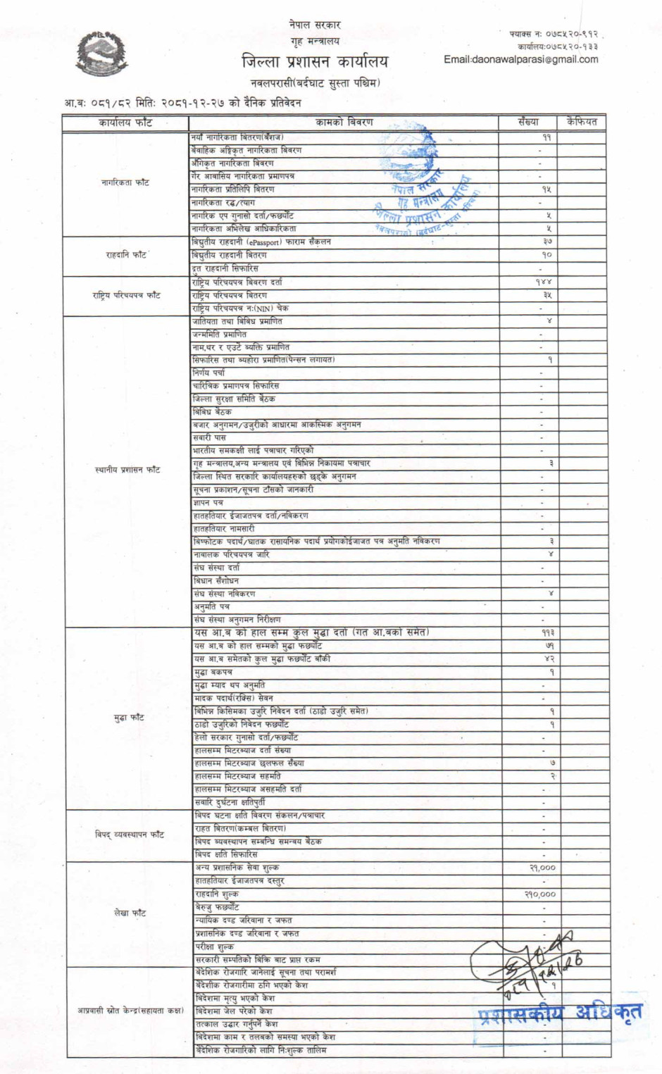 तस्बिर : मिति २०८१।१२।२७ गतेका दिन सम्पादित गरिएका कार्यको संख्यात्मक विवरण