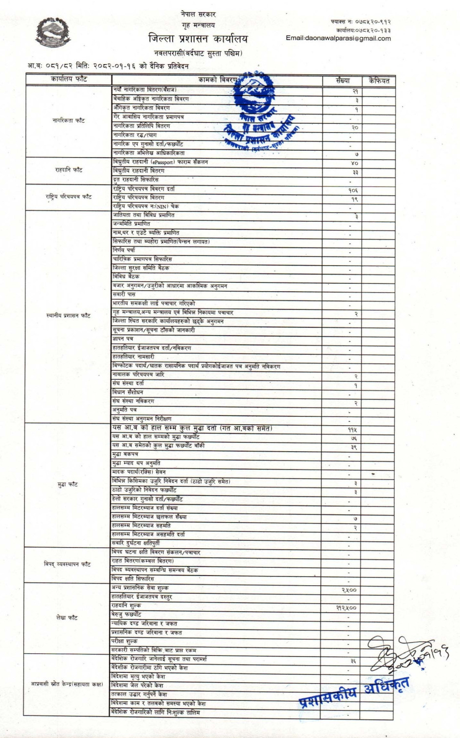 तस्बिर : मिति २०८२।०१।१६ गतेका दिन सम्पादित गरिएका कार्यको संख्यात्मक विवरण