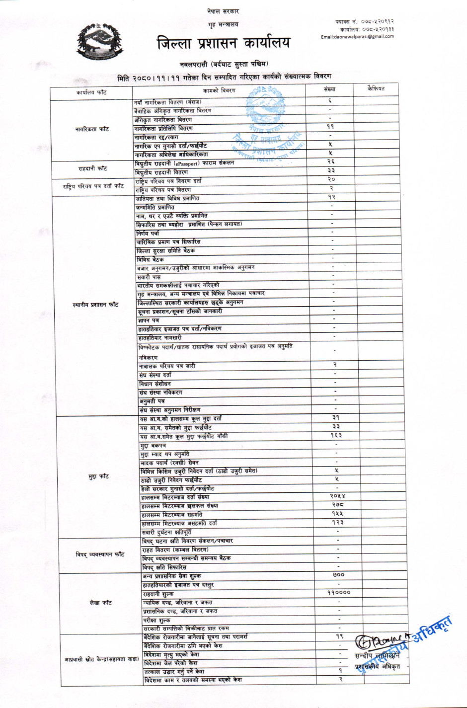 तस्बिर : मिति २०८०।११।११ गतेका दिन सम्पादित गरिएका कार्यको संख्यात्मक विवरण