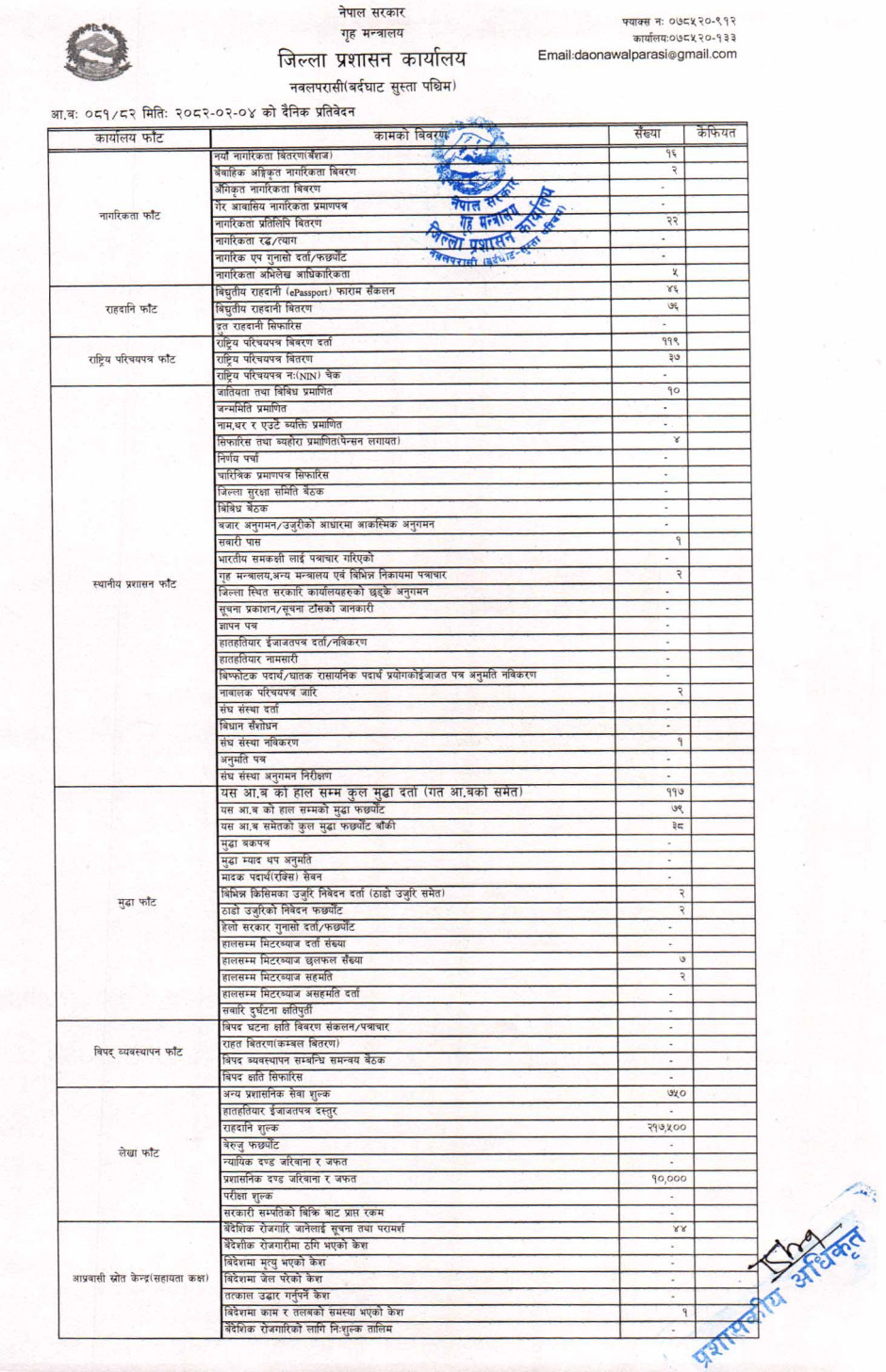 तस्बिर : मिति २०८२।०२।०४ गतेका दिन सम्पादित गरिएका कार्यको संख्यात्मक विवरण