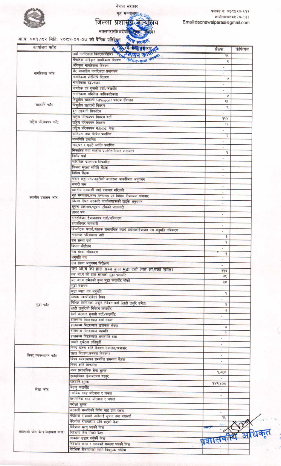 तस्बिर : मिति २०८२।०२।०७ गतेका दिन सम्पादित गरिएका कार्यको संख्यात्मक विवरण