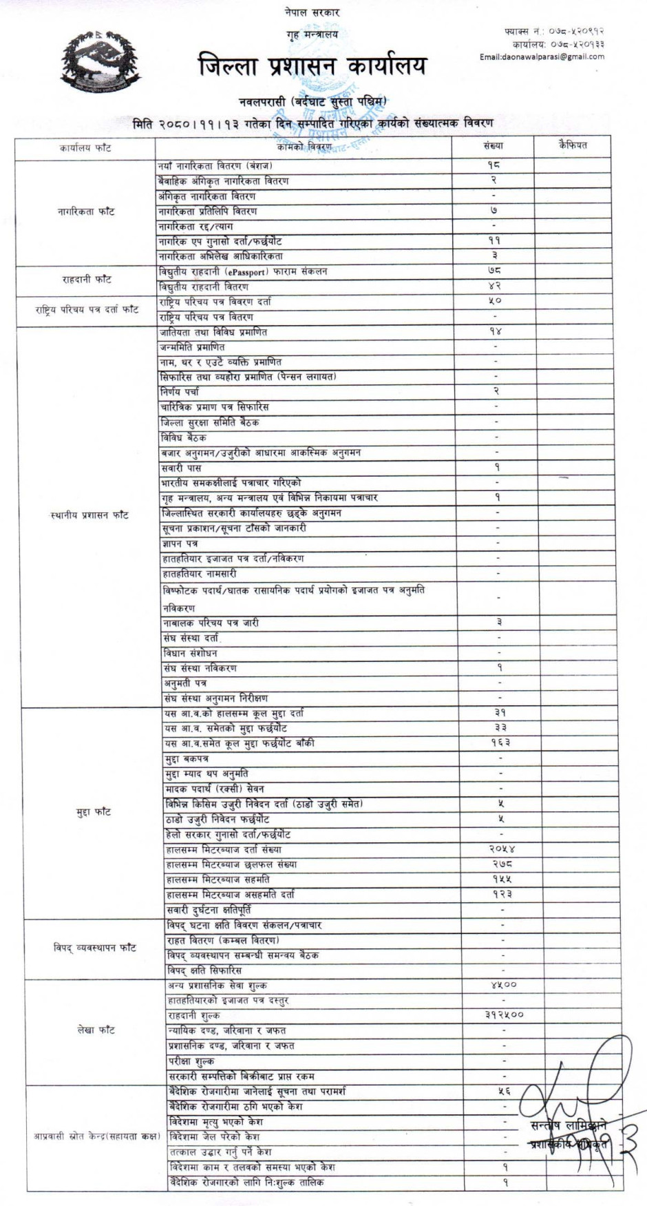 तस्बिर : मिति २०८०।११।१३ गतेका दिन सम्पादित गरिएका कार्यको संख्यात्मक विवरण