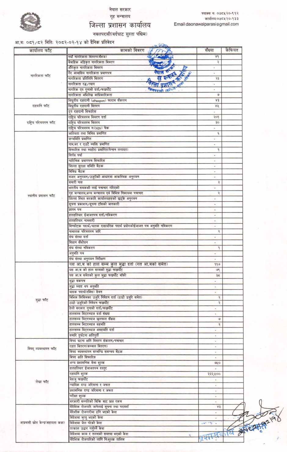 तस्बिर : मिति २०८२।०२।१४ गतेका दिन सम्पादित गरिएका कार्यको संख्यात्मक विवरण