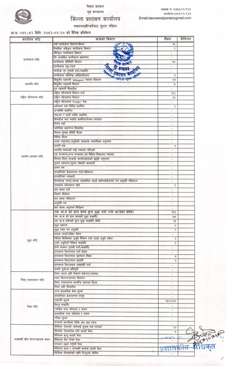 तस्बिर : मिति २०८२।०२।२० गतेका दिन सम्पादित गरिएका कार्यको संख्यात्मक विवरण