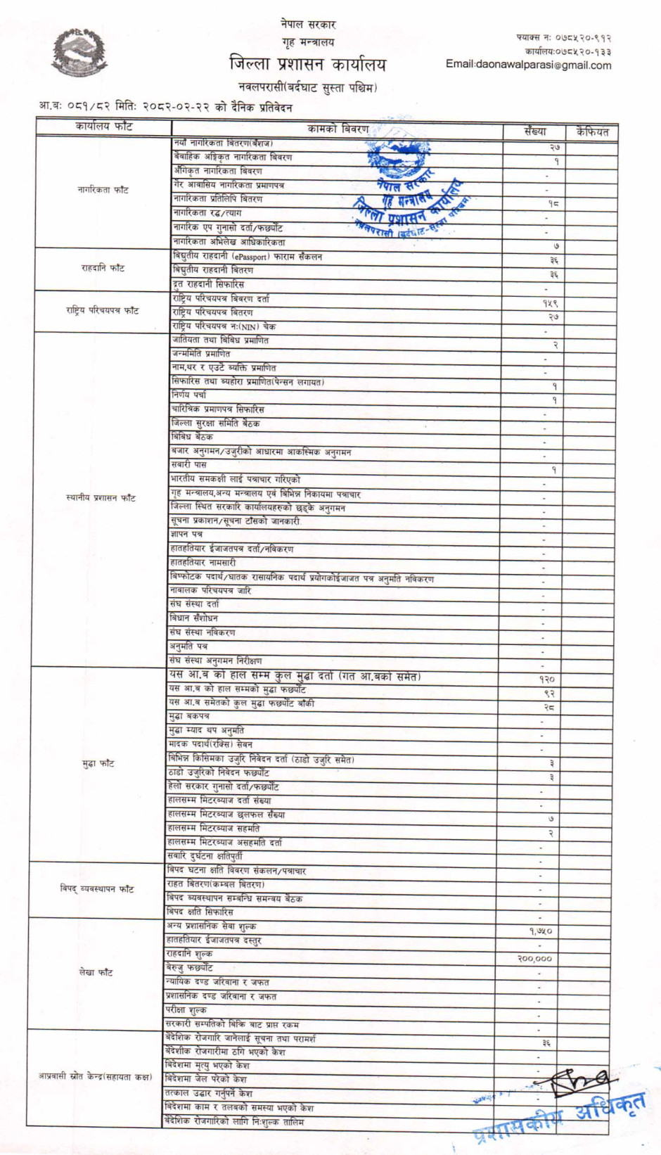 तस्बिर : मिति २०८२।०२।२२ गतेका दिन सम्पादित गरिएका कार्यको संख्यात्मक विवरण