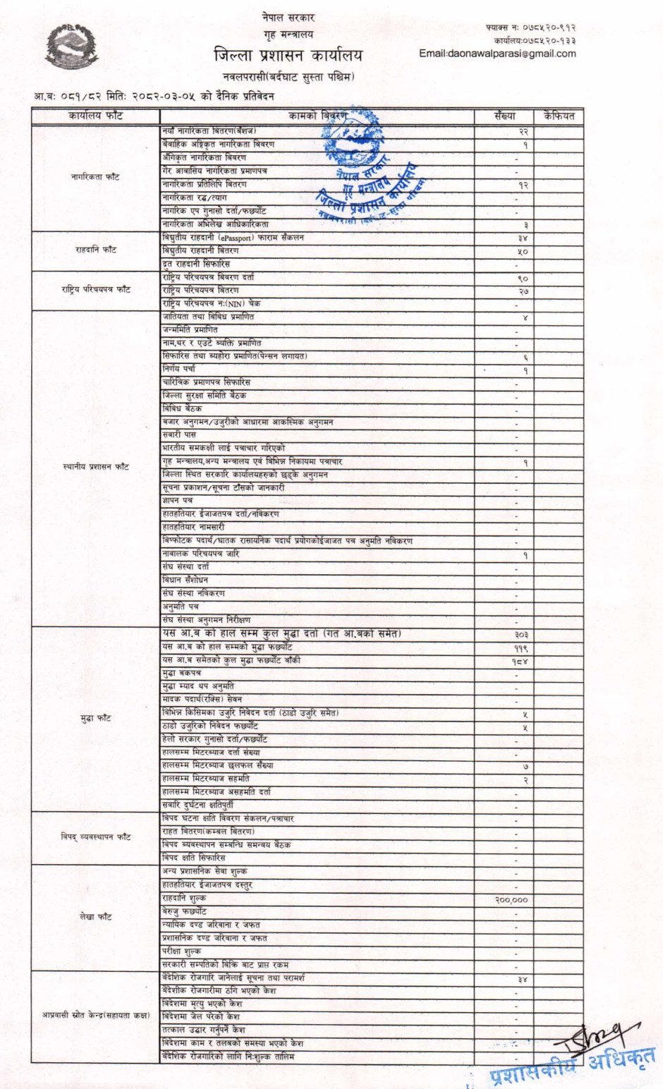 तस्बिर : मिति २०८२।०३।०५ गतेका दिन सम्पादित गरिएका कार्यको संख्यात्मक विवरण