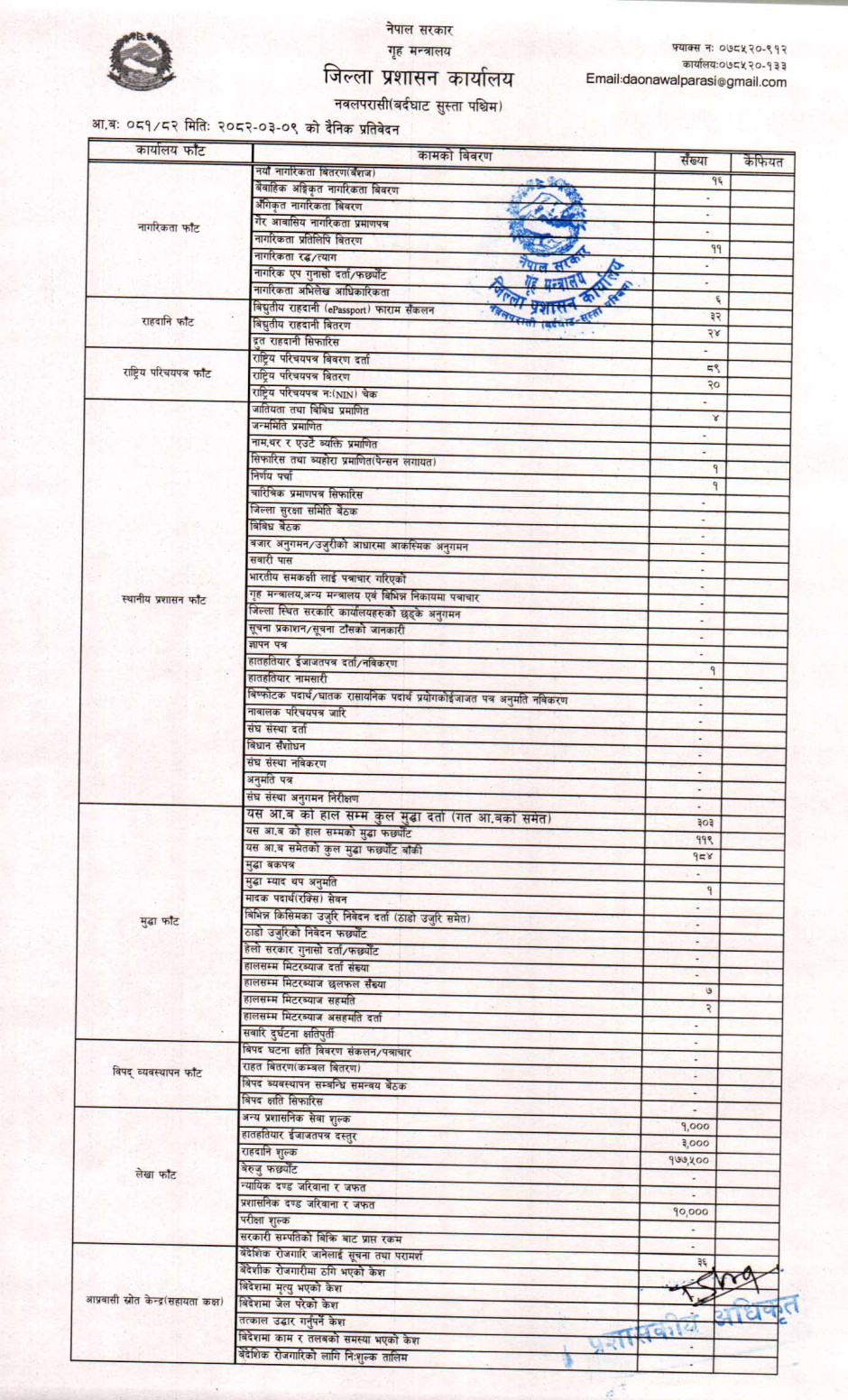 तस्बिर : मिति २०८२।०३।०९ गतेका दिन सम्पादित गरिएका कार्यको संख्यात्मक विवरण