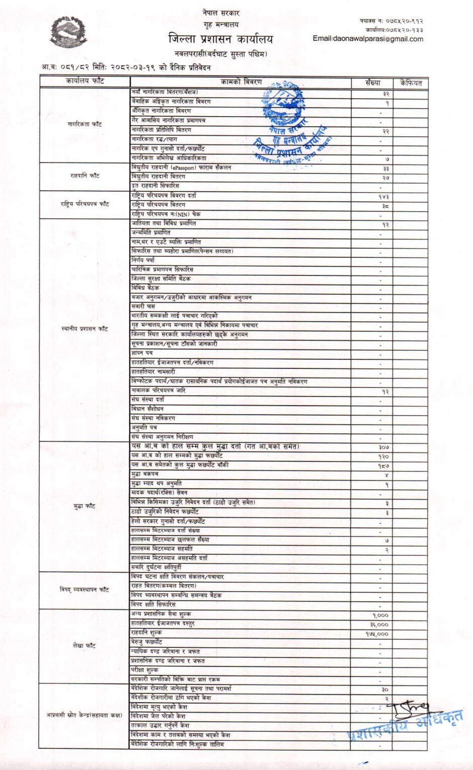 तस्बिर : मिति २०८२।०३।१९ गतेका दिन सम्पादित गरिएका कार्यको संख्यात्मक विवरण
