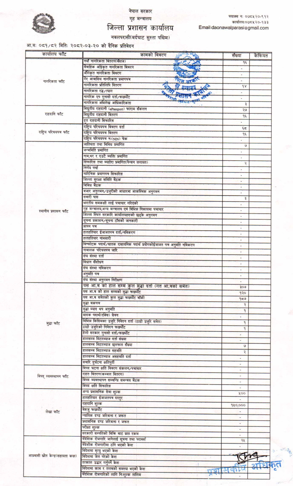 तस्बिर : मिति २०८२।०३।२० गतेका दिन सम्पादित गरिएका कार्यको संख्यात्मक विवरण