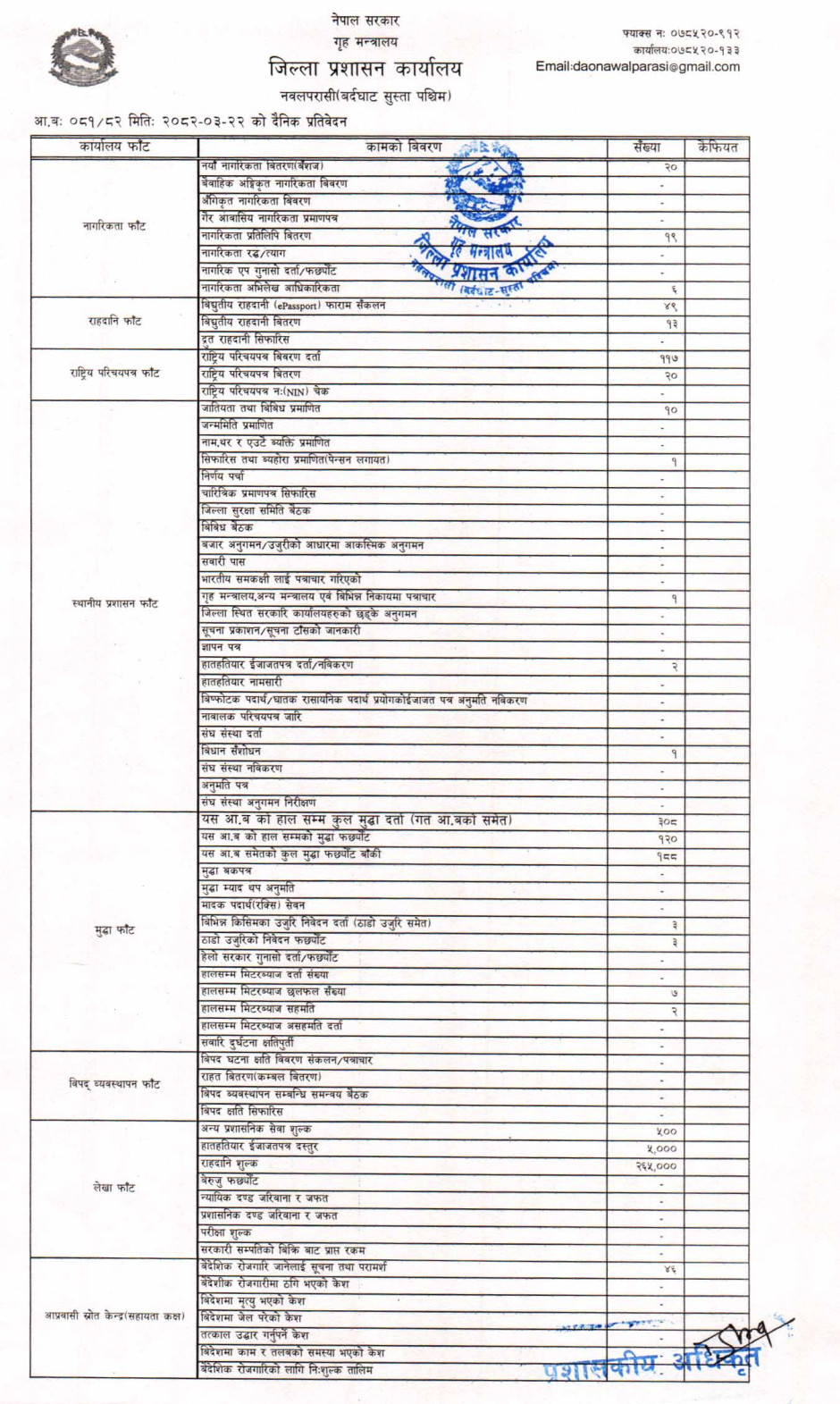 तस्बिर : मिति २०८२।०३।२२ गतेका दिन सम्पादित गरिएका कार्यको संख्यात्मक विवरण