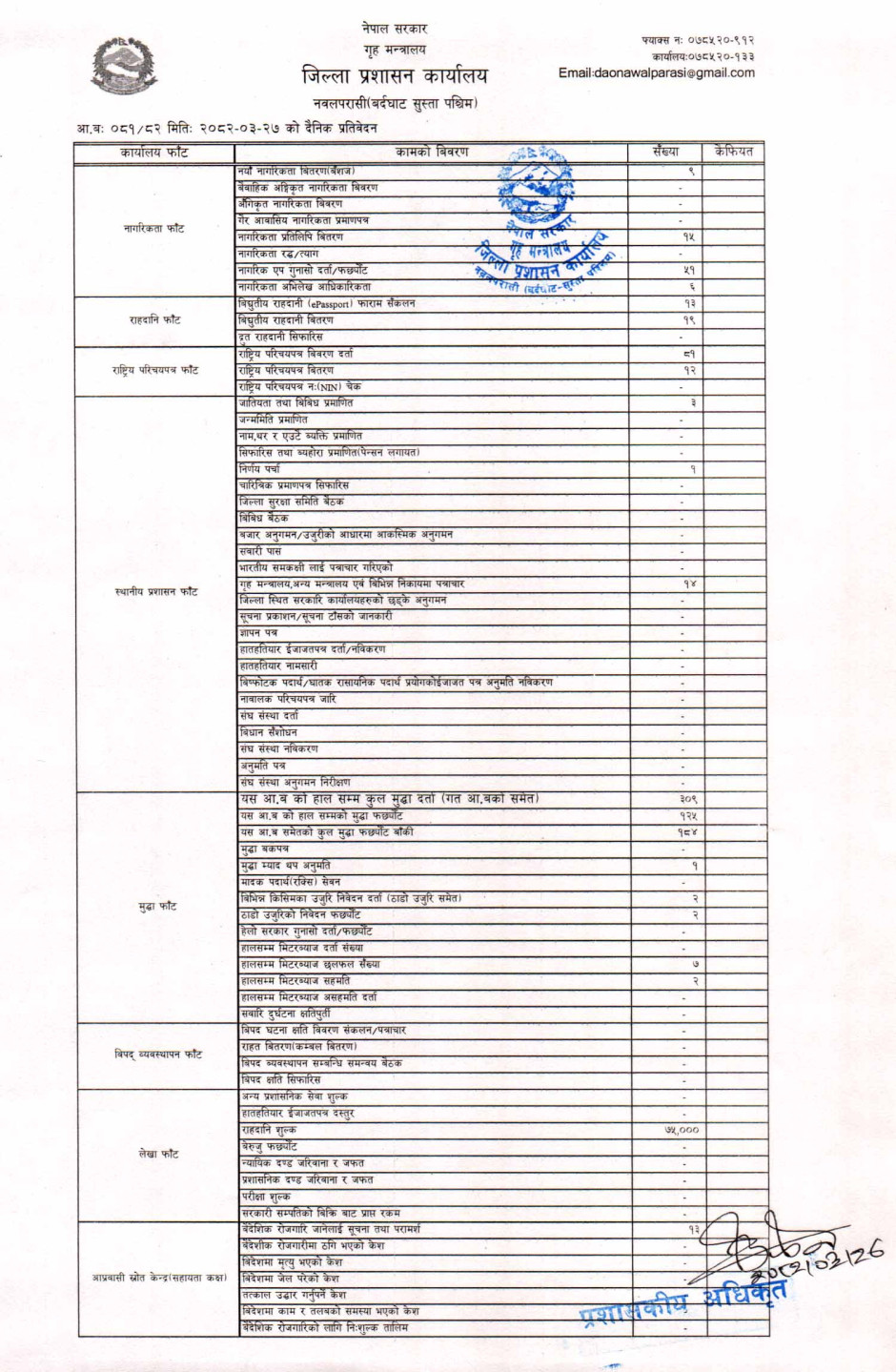तस्बिर : मिति २०८२।०३।२७ गतेका दिन सम्पादित गरिएका कार्यको संख्यात्मक विवरण
