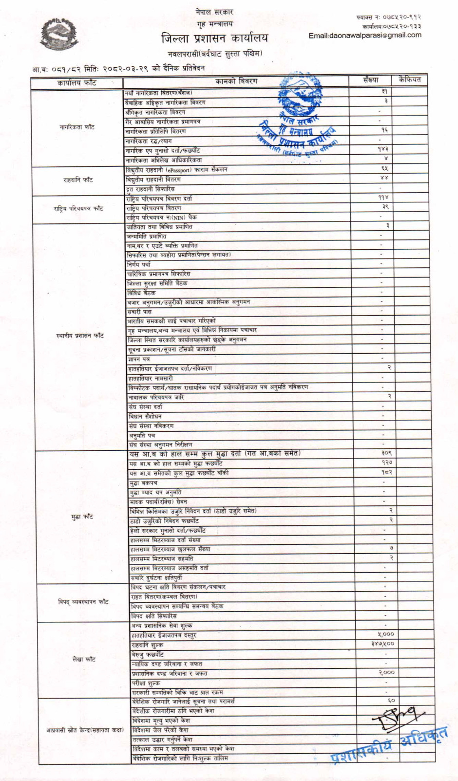 तस्बिर : मिति २०८२।०३।२९ गतेका दिन सम्पादित गरिएका कार्यको संख्यात्मक विवरण