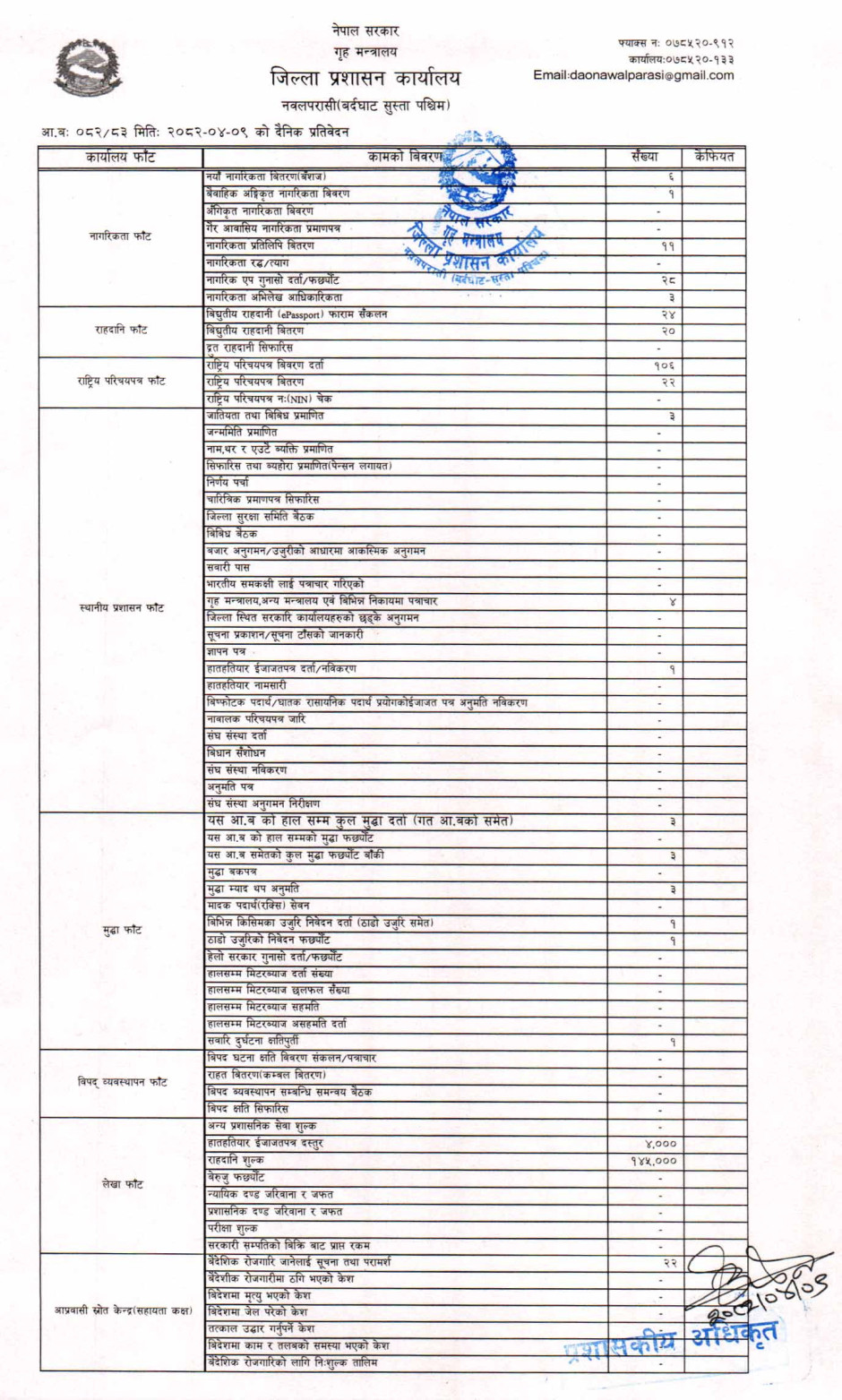 तस्बिर : मिति २०८२।०४।०९ गतेका दिन सम्पादित गरिएका कार्यको संख्यात्मक विवरण
