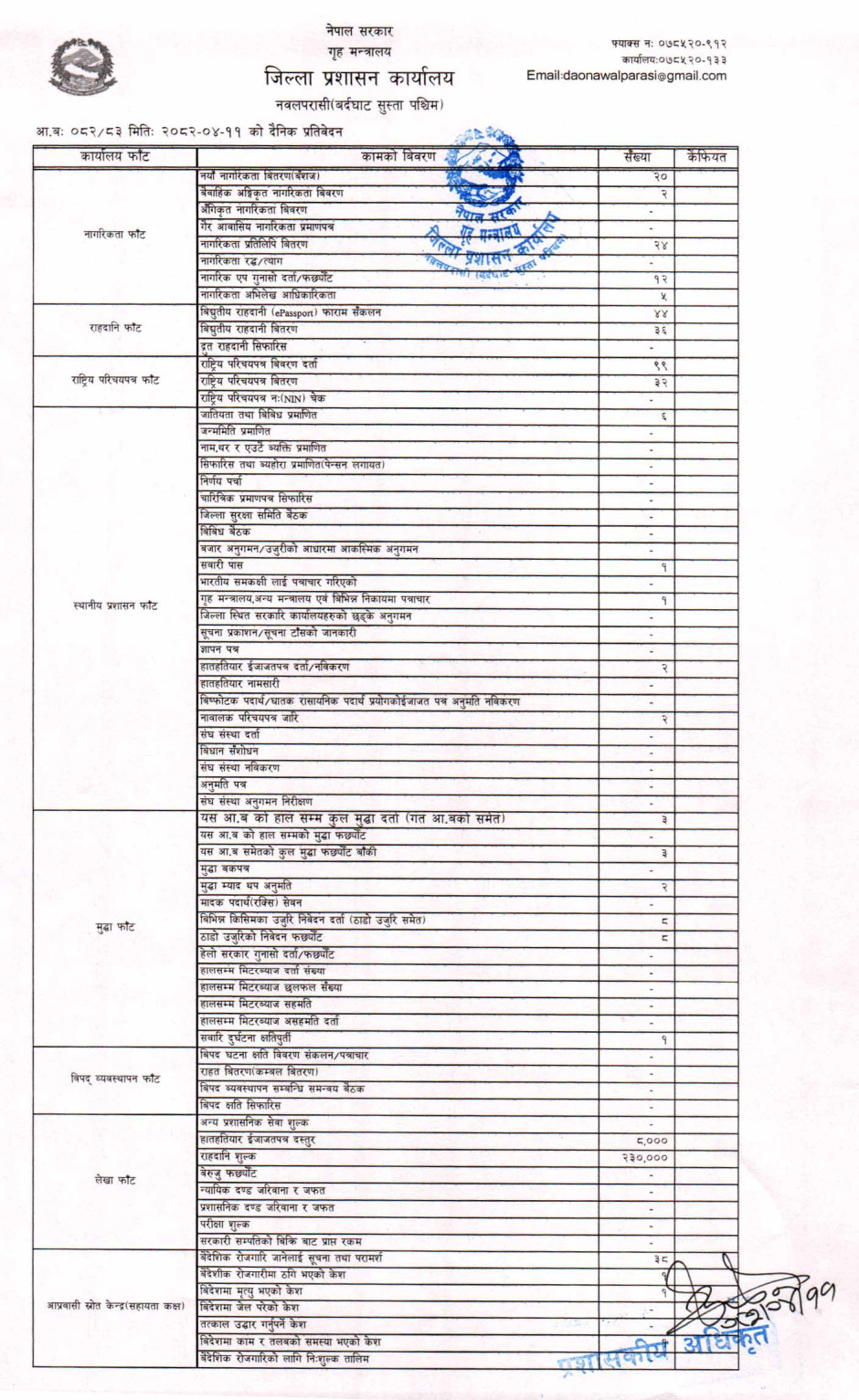 तस्बिर : मिति २०८२।०४।११ गतेका दिन सम्पादित गरिएका कार्यको संख्यात्मक विवरण