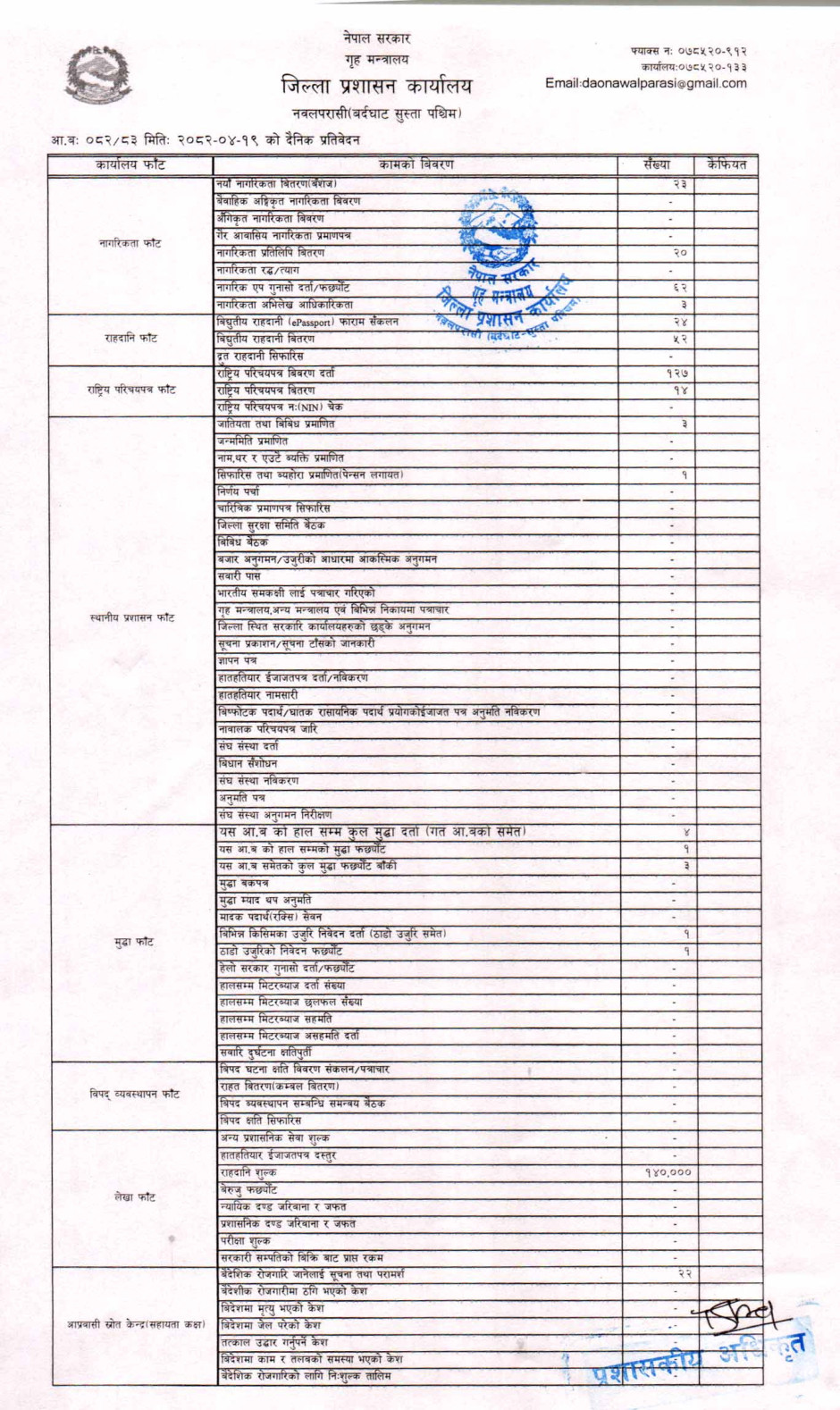 तस्बिर : मिति २०८२।०४।१९ गतेका दिन सम्पादित गरिएका कार्यको संख्यात्मक विवरण