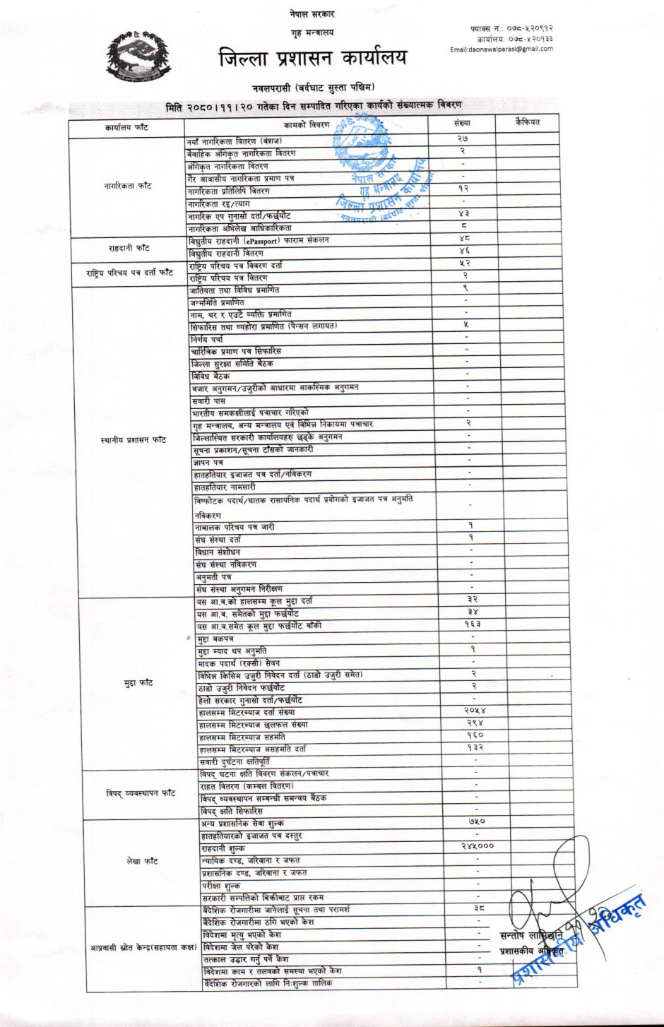 तस्बिर : मिति २०८०।११।२० गतेका दिन सम्पादित गरिएका कार्यको संख्यात्मक विवरण