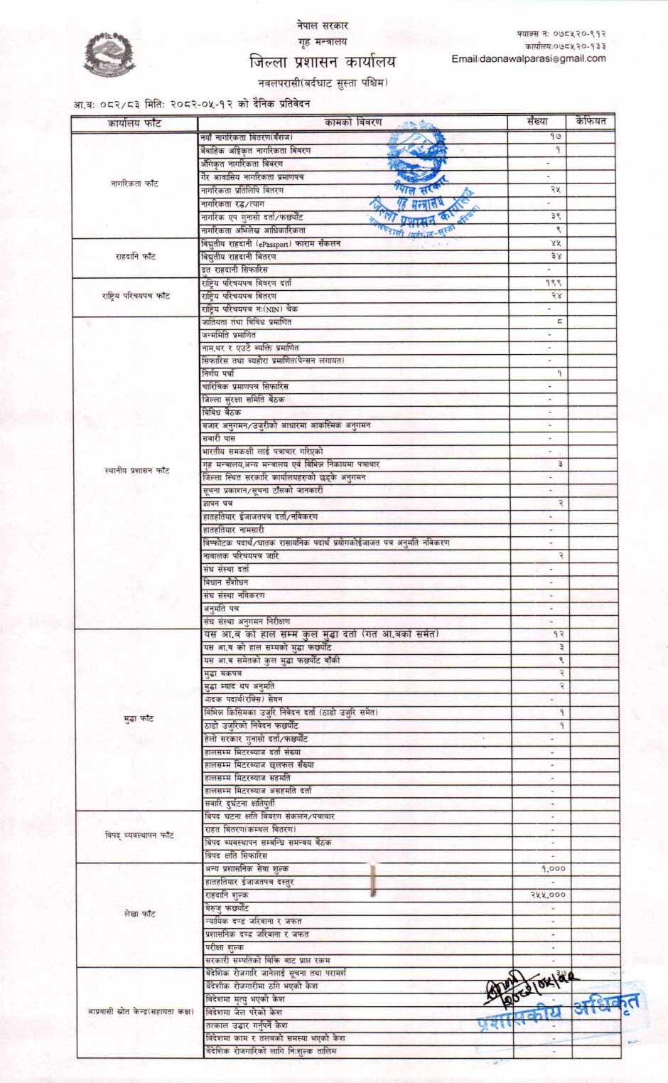 तस्बिर : मिति २०८२।०५।१२ गतेका दिन सम्पादित गरिएका कार्यको संख्यात्मक विवरण