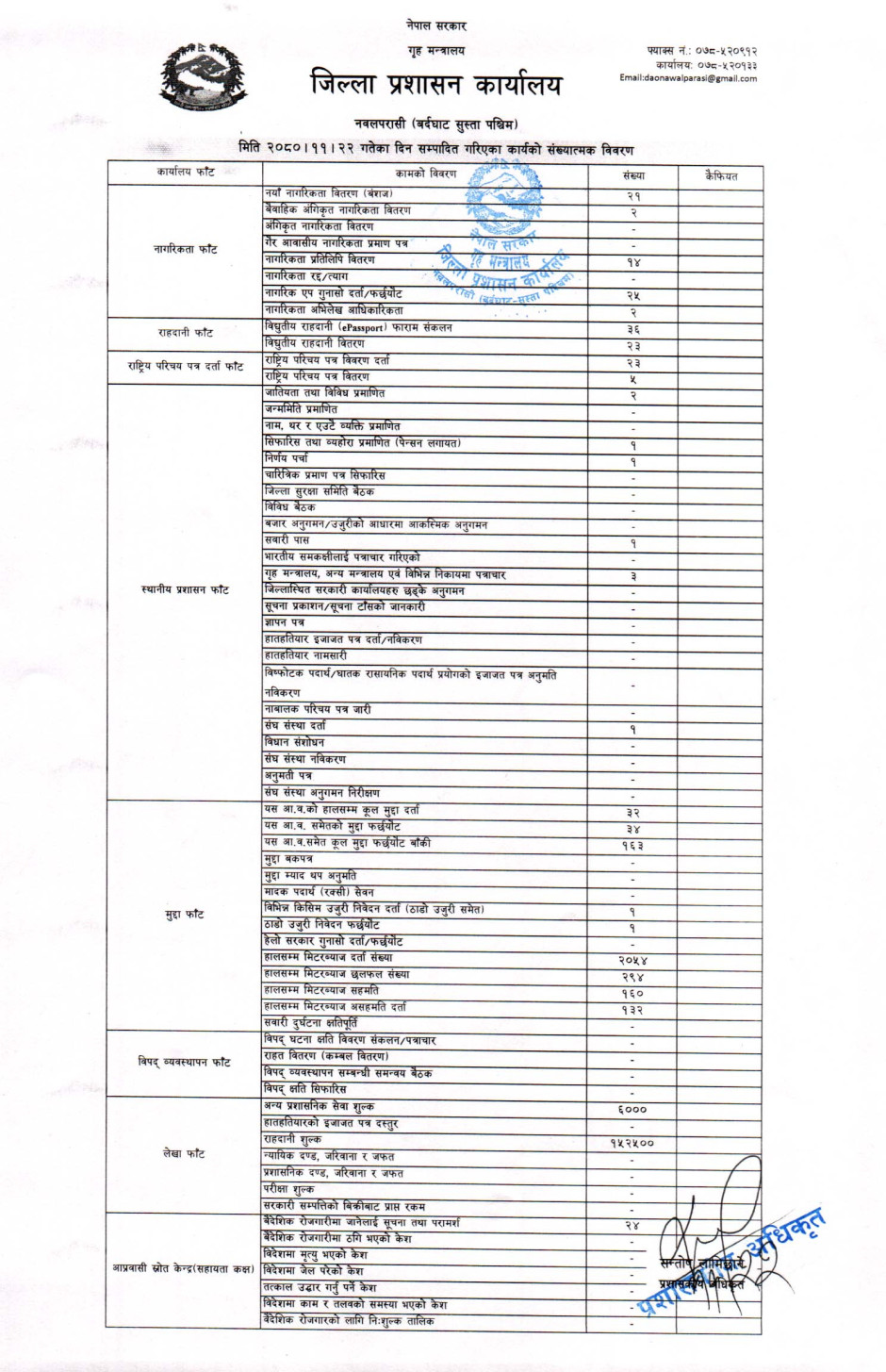 तस्बिर : मिति २०८०।११।२२ गतेका दिन सम्पादित गरिएका कार्यको संख्यात्मक विवरण