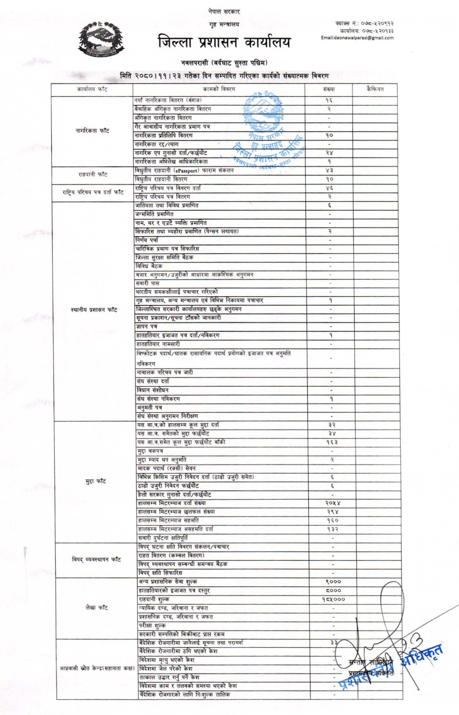 तस्बिर : मिति २०८०।११।२३ गतेका दिन सम्पादित गरिएका कार्यको संख्यात्मक विवरण
