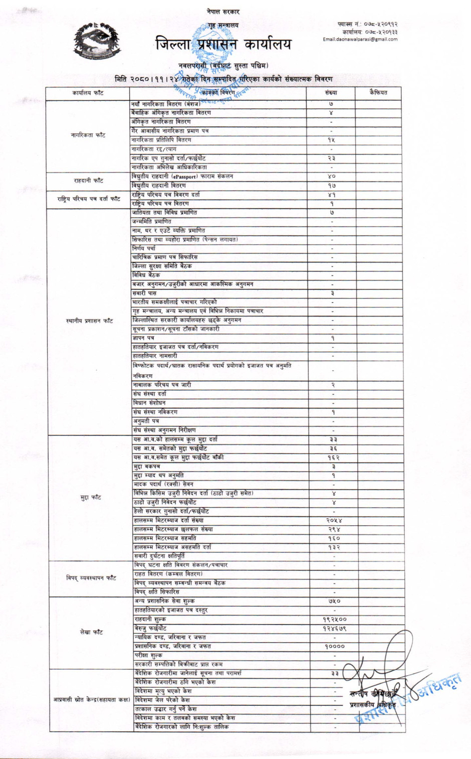 तस्बिर : मिति २०८०।११।२४ गतेका दिन सम्पादित गरिएका कार्यको संख्यात्मक विवरण