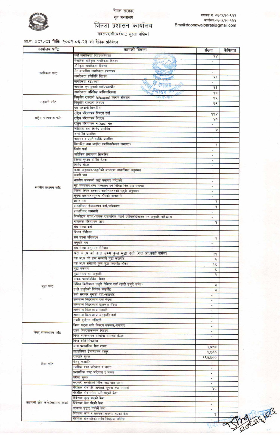 तस्बिर : मिति २०८२।०६।२३ गतेका दिन सम्पादित गरिएका कार्यको संख्यात्मक विवरण