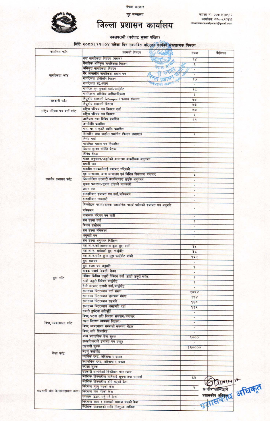 तस्बिर : मिति २०८०।१२।०४ गतेका दिन सम्पादित गरिएका कार्यको संख्यात्मक विवरण