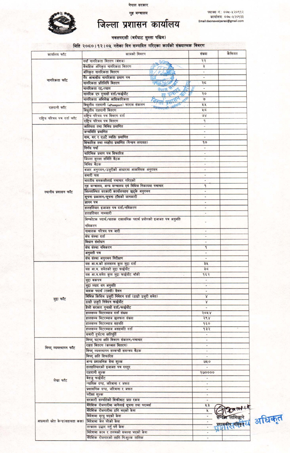 तस्बिर : मिति २०८०।१२।०५ गतेका दिन सम्पादित गरिएका कार्यको संख्यात्मक विवरण