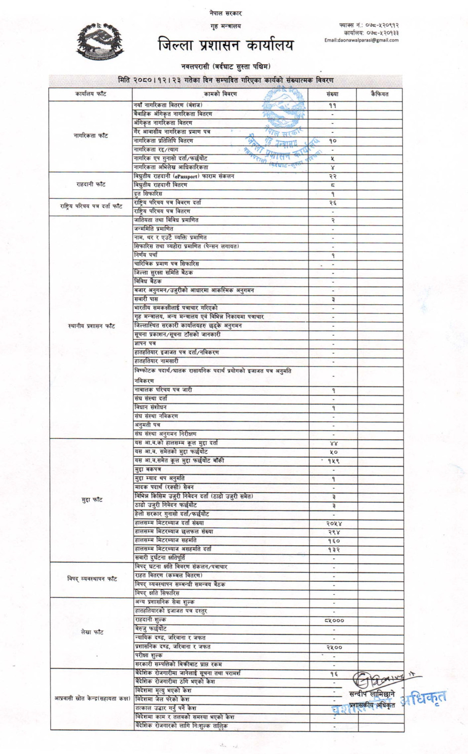 तस्बिर : मिति २०८०।१२।२३ गतेका दिन सम्पादित गरिएका कार्यको संख्यात्मक विवरण