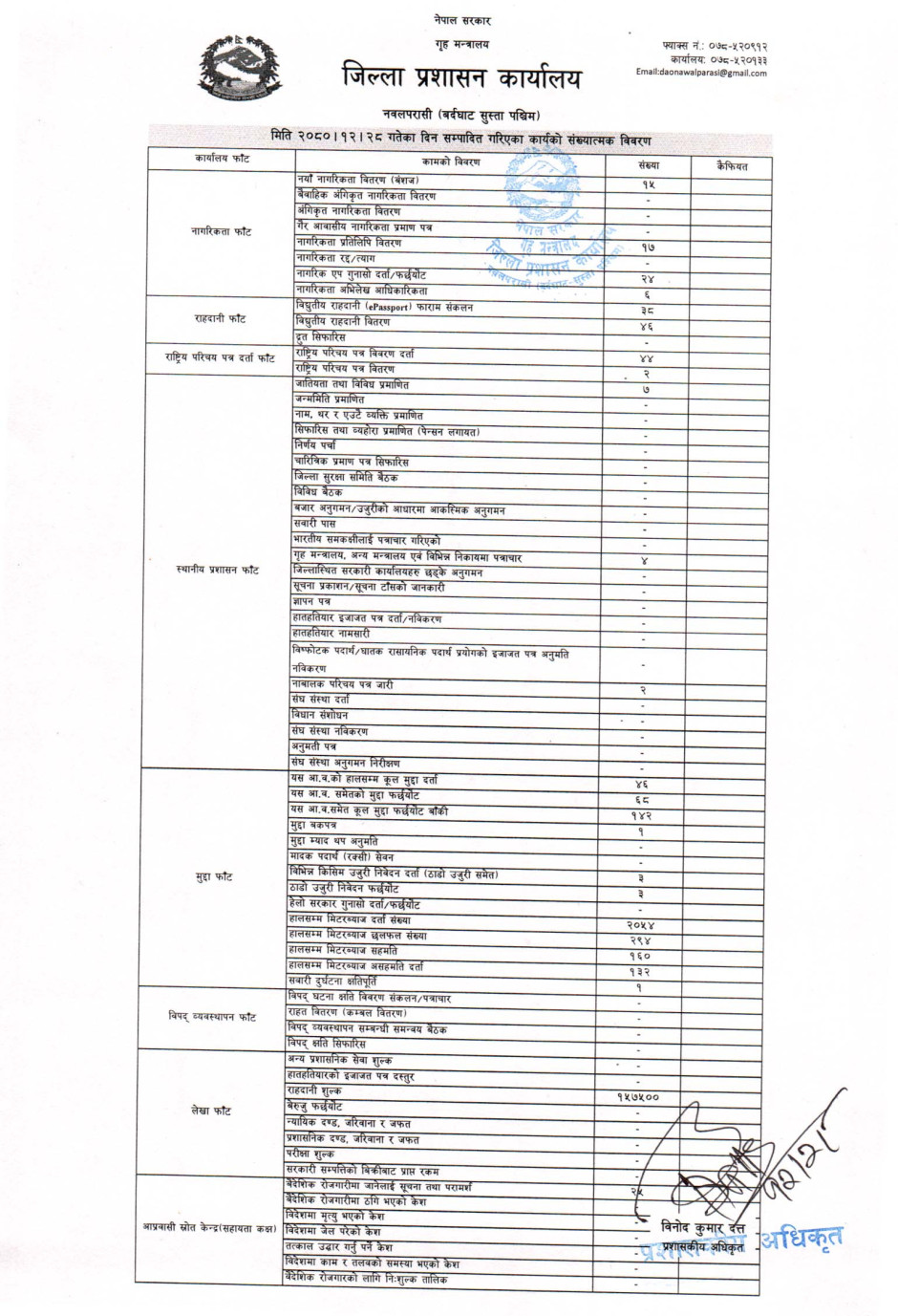 तस्बिर : मिति २०८०।१२।२८ गतेका दिन सम्पादित गरिएका कार्यको संख्यात्मक विवरण