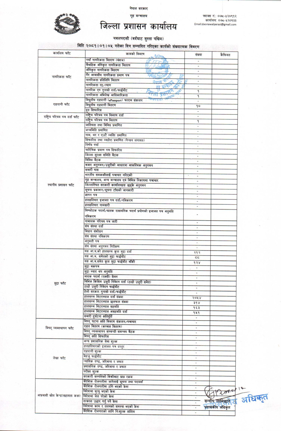 तस्बिर : मिति २०८१।०१।०५ गतेका दिन सम्पादित गरिएका कार्यको संख्यात्मक विवरण