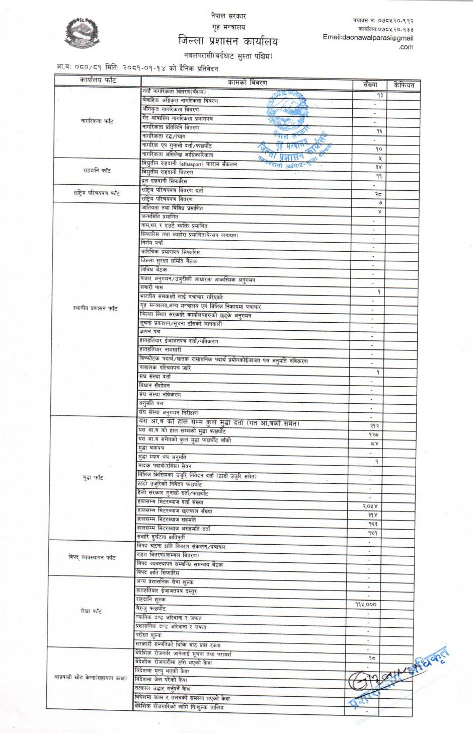 तस्बिर : मिति २०८१।०१।१४ गतेका दिन सम्पादित गरिएका कार्यको संख्यात्मक विवरण
