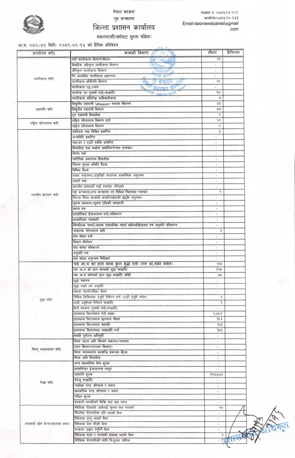तस्बिर : मिति २०८१।०१।१६ गतेका दिन सम्पादित गरिएका कार्यको संख्यात्मक विवरण