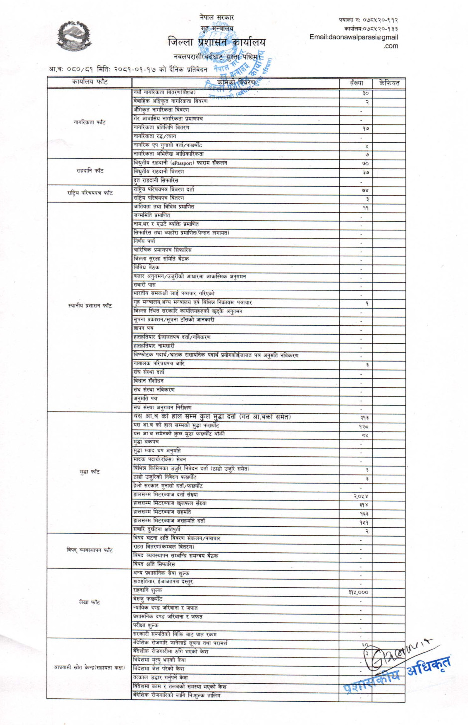 तस्बिर : मिति २०८१।०१।१७ गतेका दिन सम्पादित गरिएका कार्यको संख्यात्मक विवरण