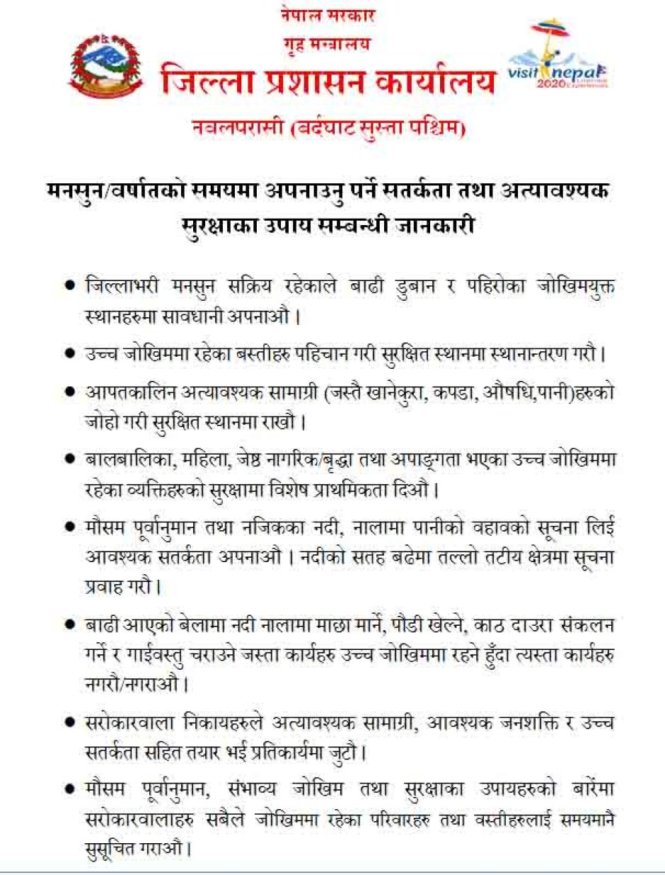 मनसुन/वर्षातको समयमा अपनाउनु पर्ने सतर्कता तथा अत्यावश्यक सुरक्षाका उपाय सम्बन्धी जानकारी