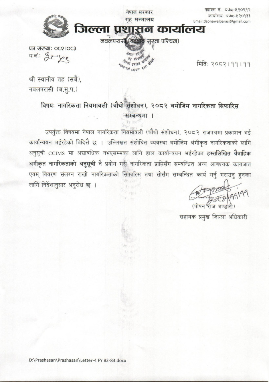 तस्बिर : नागरिकता नियमावली (चौथो संशोधन), २०८२ बमोजिम नागरिकता सिफारिस सम्बन्धमा ।