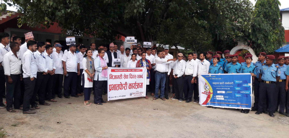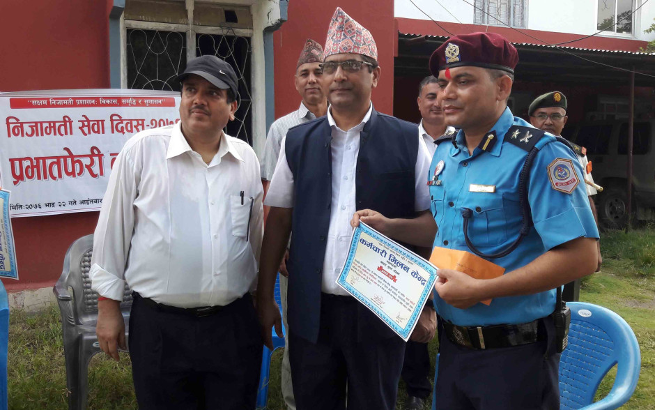 आज मिति २०७६ साल भदौ २२ गते जिल्लास्थित सबै सरकारी कार्यालय, स्थानीय तह, सबै सुरक्षा निकाय, ट्रेड युनियन लगायतका प्रमुख एवं प्रतिनिधिहरुको ब्यापक सहभागितामा निजामती सेवा दिवस, २०७६ "सक्षम निजामती प्रशासन: विकास, समृद्धि र सुशासन" भन्ने मूल नाराको ब्यानर र प्लेकार्डको साथ आज भदौ २२ गते बजारक्षेत्रमा प्रभातफेरी सहित भव्य रुपमा विभिन्न कार्यक्रम गरी सम्पन्न भएको छ ।