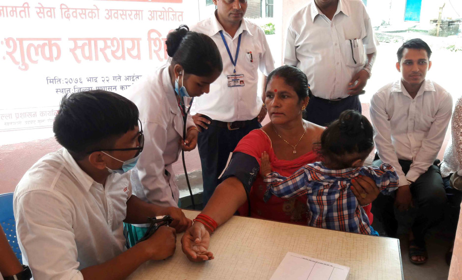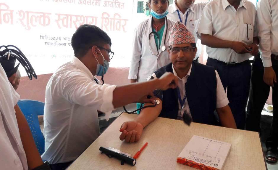 त्यस्तै दिवसको अवसरमा आज कार्यालयमा प्रथम सेवा लिन आउने ३ जना सेवाग्राहीहरुलाई खादा ओढाई सम्मान गरी कार्यालय संचालनमा ल्याई सेवा लिन आउने अन्य सेवाग्राहीहरुलाई लक्षित गरी स्वास्थ्य कार्यालय नवलपरासी (बसुप) र पृथ्वीचन्द्र अस्पतालद्वारा संयुक्त रुपमा निशुल्क स्वास्थ्य शिविर संचालन गरी ११५ जनाको स्वास्थ्य परीक्षण गरिएको छ ।