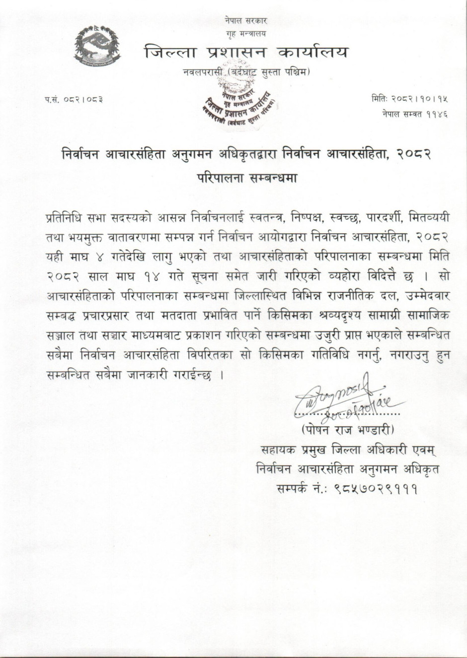 तस्बिर : निर्वाचन आचारसंहिता अनुगमन अधिकृतद्वारा निर्वाचन आचारसंहिता, २०८२ परिपालना सम्बन्धमा