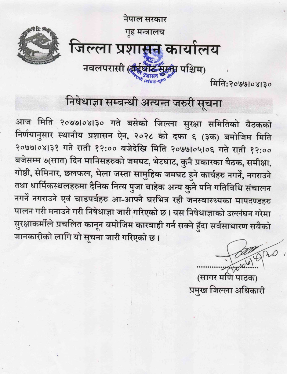 © सर्वाधिकार सुरक्षित जिल्ला प्रशासन कार्यालय, नवलपरासी (बर्दघाट सुस्ता पश्चिम) .