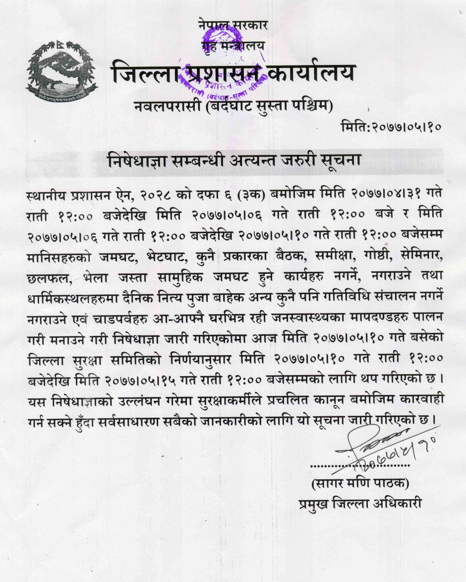 निषेधाज्ञा थप गरिएको सम्बन्धी अत्यन्त जरुरी सूचना