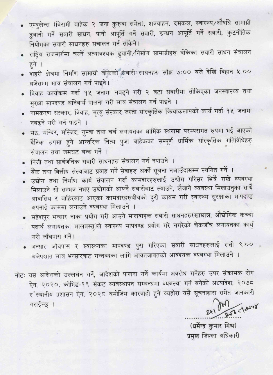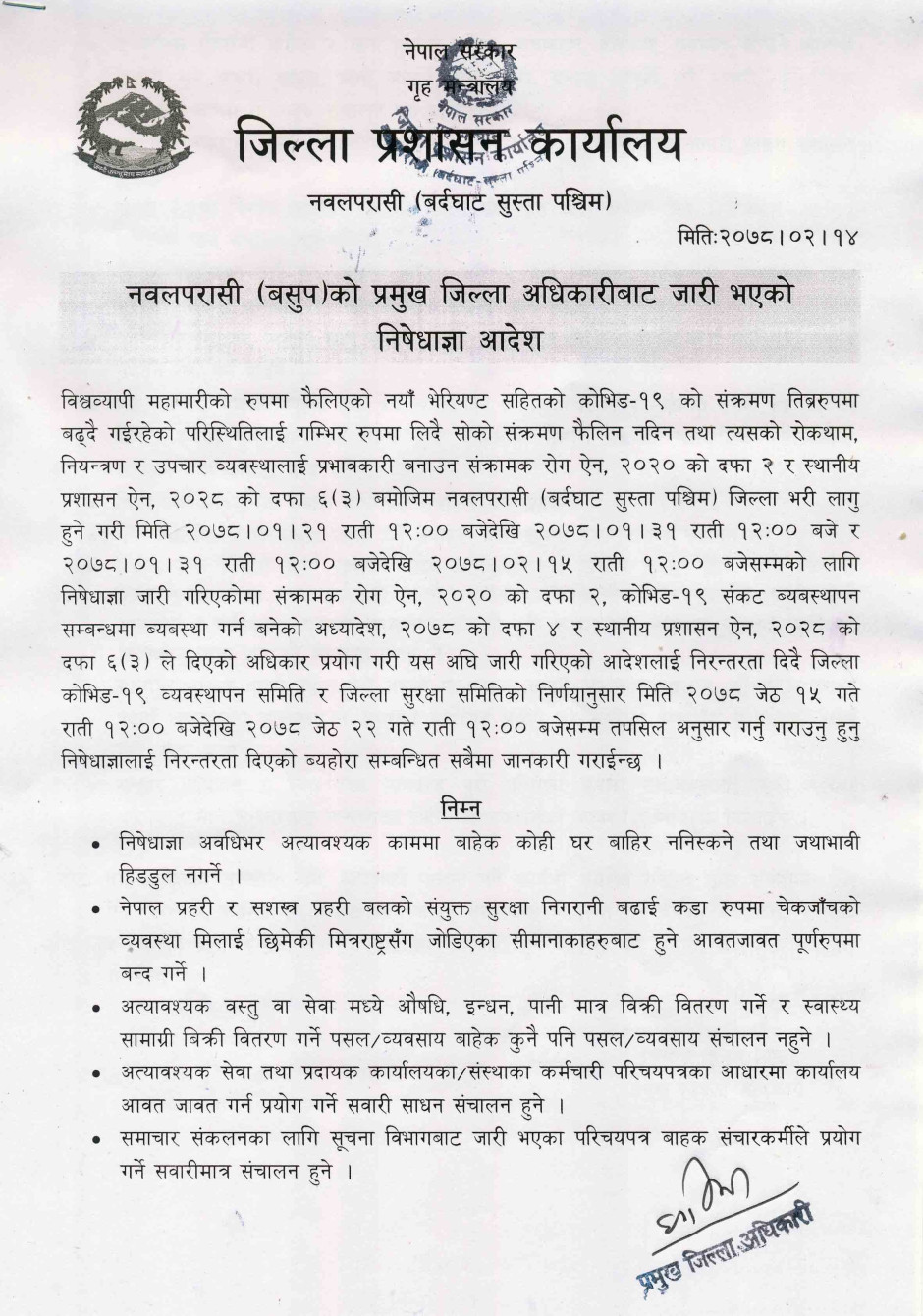 तस्बिर : नवलपरासी (बसुप)को प्रमुख जिल्ला अधिकारीबाट जारी भएको निषेधाज्ञा आदेश