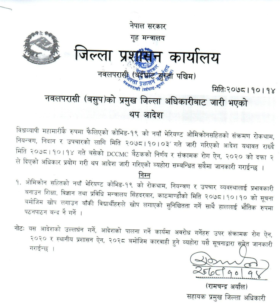 तस्बिर : नवलपरासी (बसुप)को प्रमुख जिल्ला अधिकारीबाट जारी भएको थप आदेश