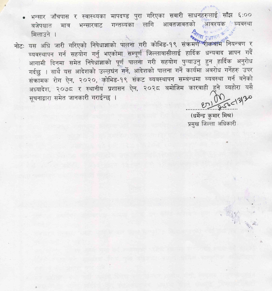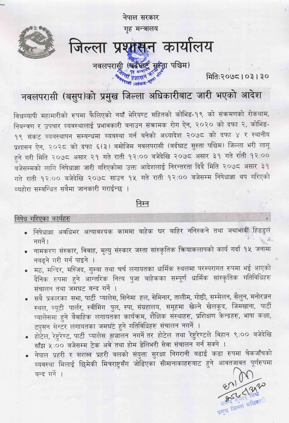 तस्बिर : नवलपरासी (बसुप)को प्रमुख जिल्ला अधिकारीबाट मिति २०७८।०३।३० गते जारी गरिएको निषेधाज्ञा आदेश