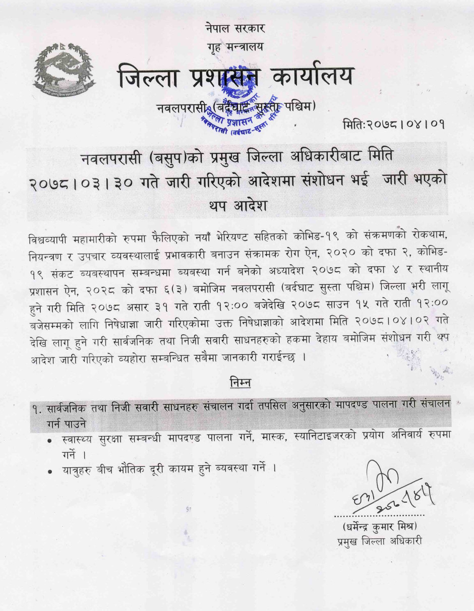 तस्बिर : नवलपरासी (बसुप)को प्रमुख जिल्ला अधिकारीबाट मिति २०७८।०३।३० गते जारी गरिएको आदेशमा संशोधन भई जारी भएको थप आदेश