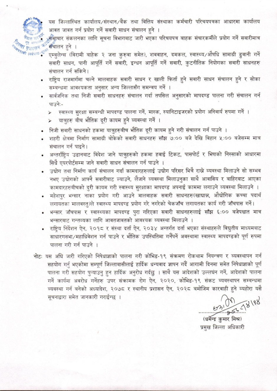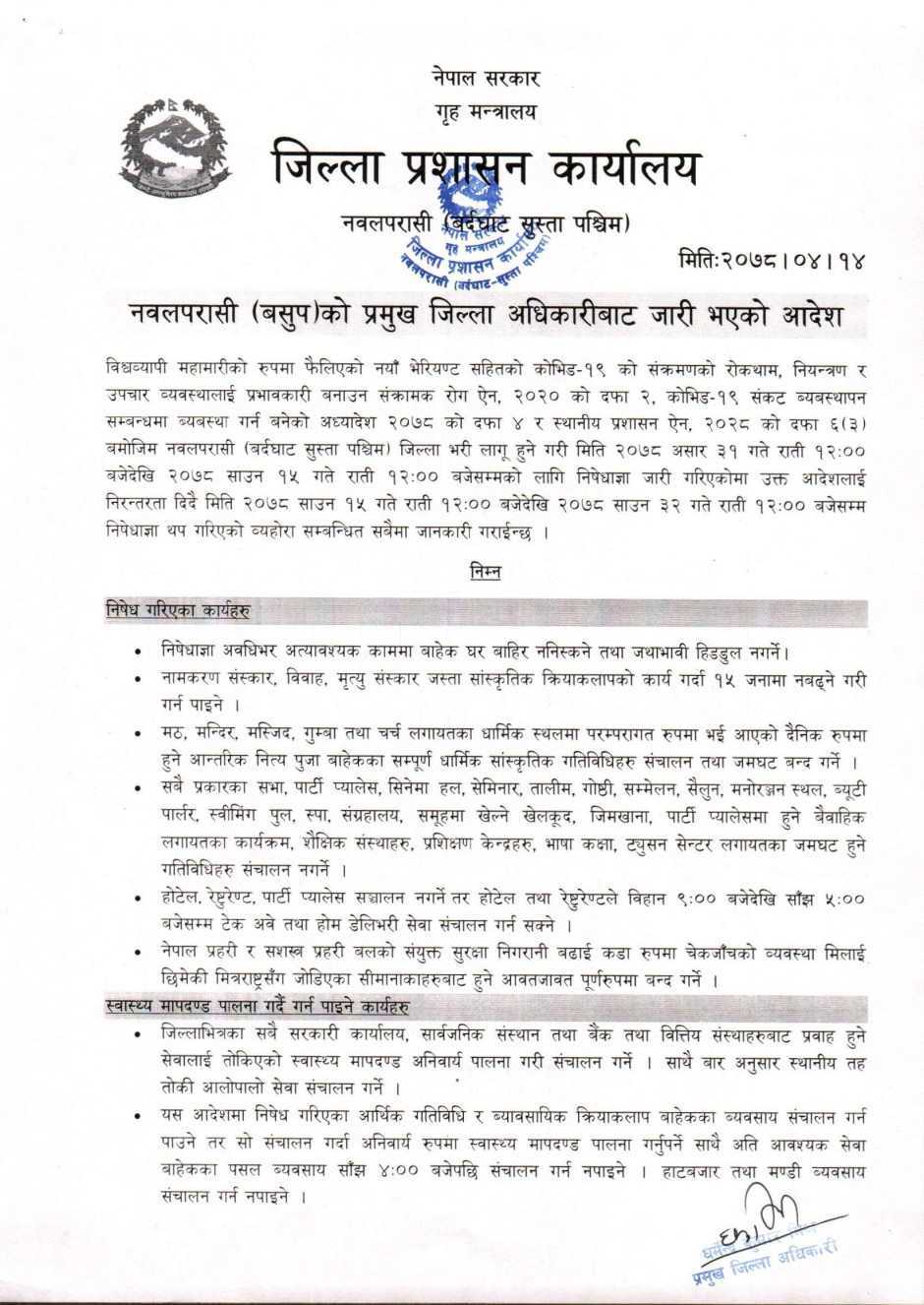 तस्बिर : नवलपरासी (बसुप)को प्रमुख जिल्ला अधिकारीबाट मिति २०७८।०४।१४ गते जारी गरिएको निषेधाज्ञा आदेश