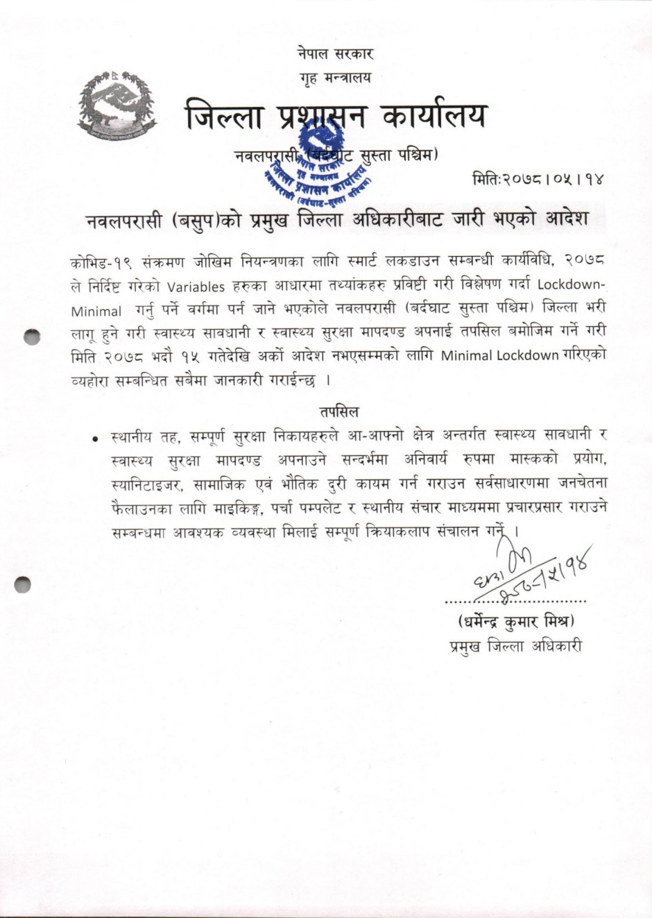 तस्बिर : नवलपरासी (बसुप)को प्रमुख जिल्ला अधिकारीबाट मिति २०७८।०५।१४ गते जारी गरिएको निषेधाज्ञा आदेश