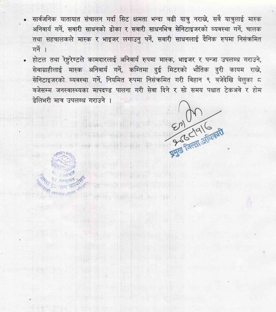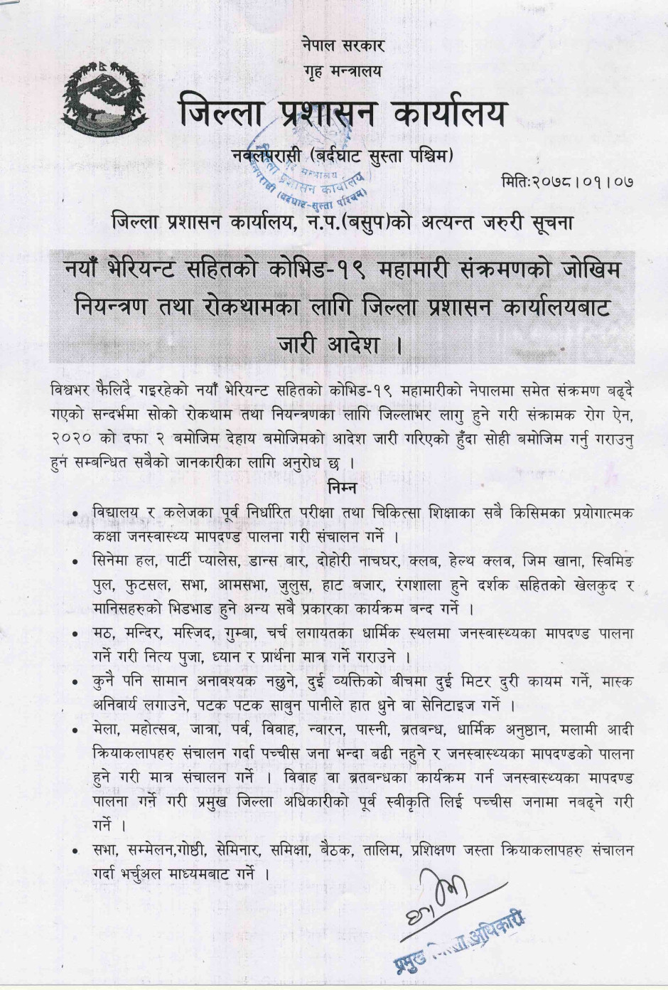 तस्बिर : नयाँ भेरियन्ट सहितको कोभिड-१९ महामारी संक्रमणको जोखिम नियन्त्रण तथा रोकथामका लागि जिल्ला प्रशासन कार्यालयबाट जारी आदेश ।