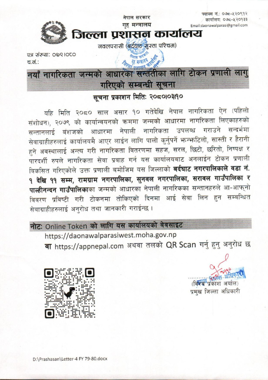 तस्बिर : नयाँ नागरिकता जन्मको आधारका सन्ततीका लागि टोकन प्रणाली लागु गरिएको सम्बन्धी सूचना